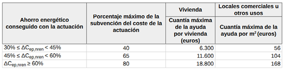 La cantidad de ayuda a percibir dependerá del ahorro energético conseguido con la actuación llevada a cabo. Podemos consultarlo en la siguiente tabla: